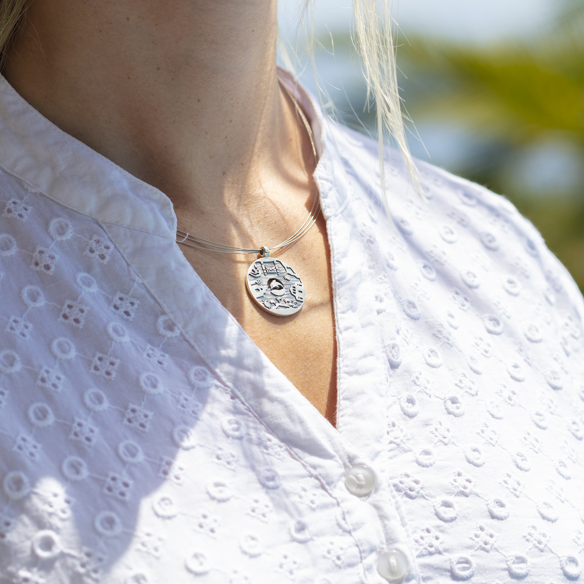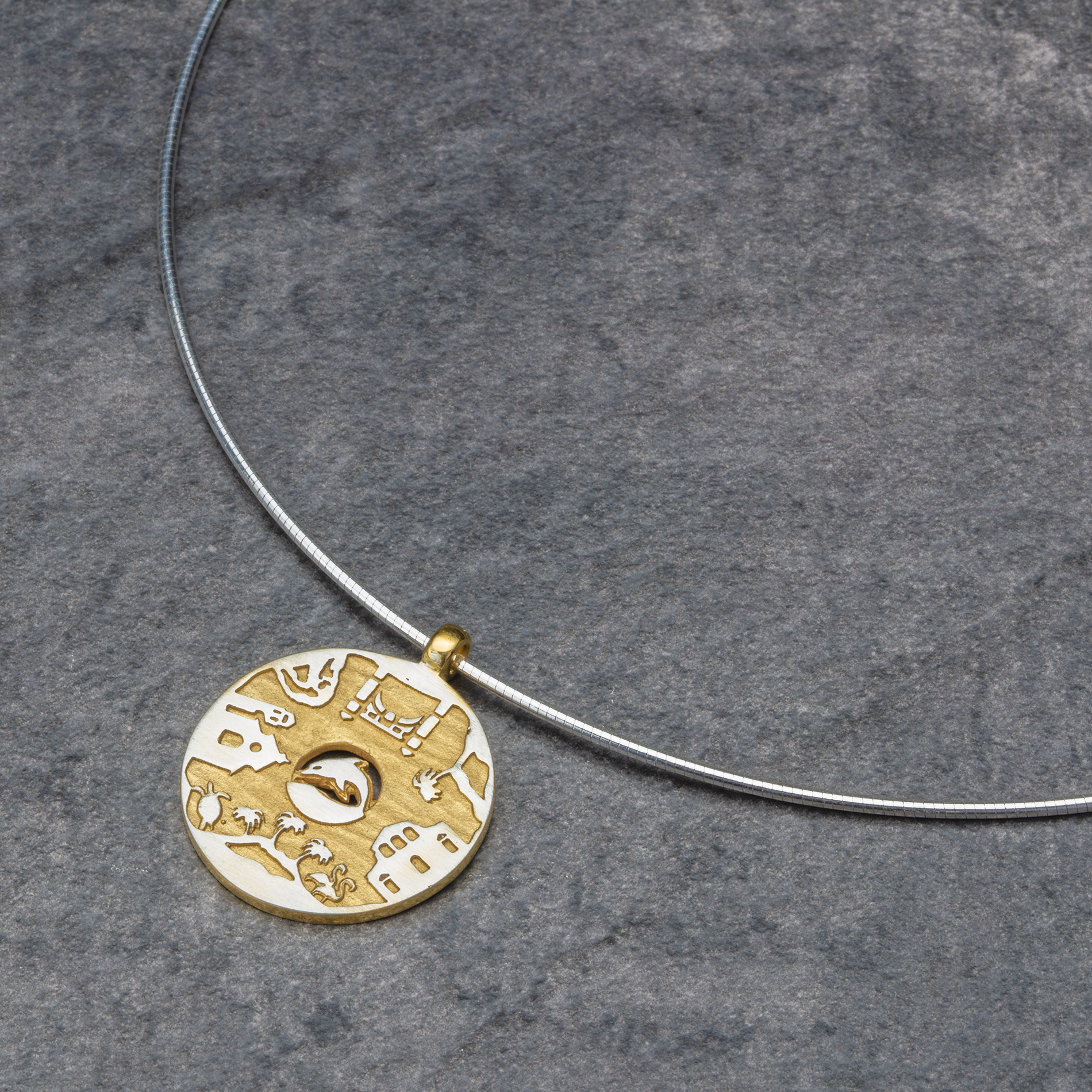 Der Routen-Anhänger Karibische Inseln aus 925er Sterling-Silber nimmt Sie mit auf die Reise in die zauberhafte Landschaft der karibischen Inseln. Der Anhänger wird in einer Rostocker Goldschmiedewerkstatt handgefertigt und hat einen Durchmesser von ca. 26,5 mm.